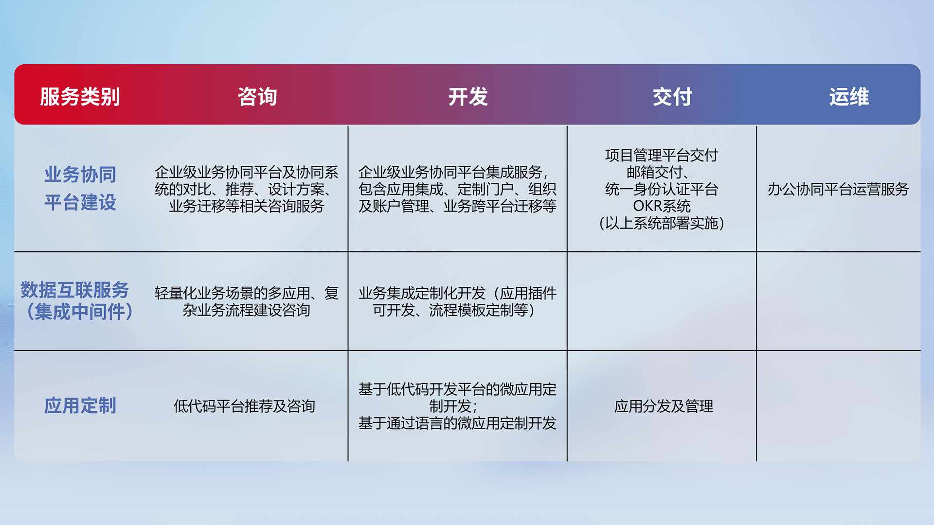 针对钉钉、、、、企微、、、、IDaas等平台级产品提供产品的规划、、方案、、交付、、、、定制化开发等服务,,,实现如统一协同办公、、、、智能客户服务、、混合会议管理、、智能数据查询、、等业务场景,,,,实现数字化转型。。。。